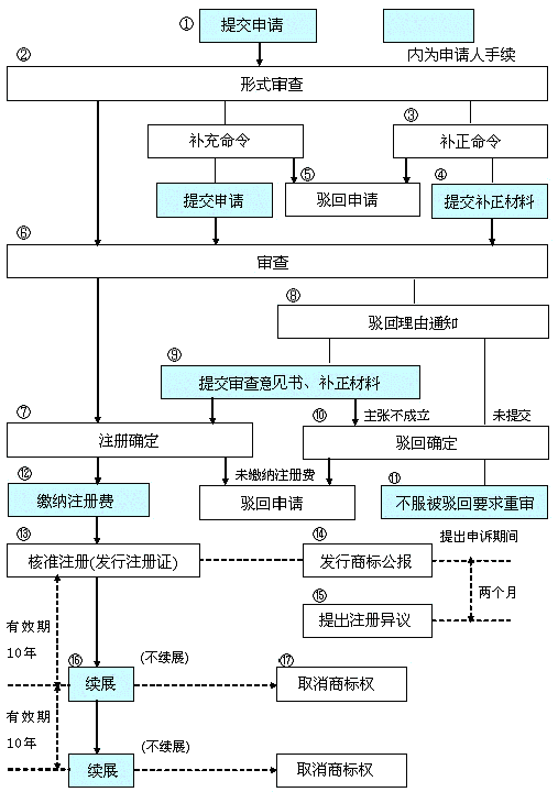 (16)核準(zhǔn)注冊(cè)日起10年后,可辦理有效期續(xù)展手續(xù)。(有關(guān)手續(xù)期限請(qǐng)參見〈續(xù)展〉)